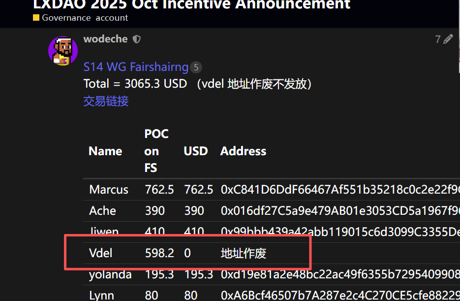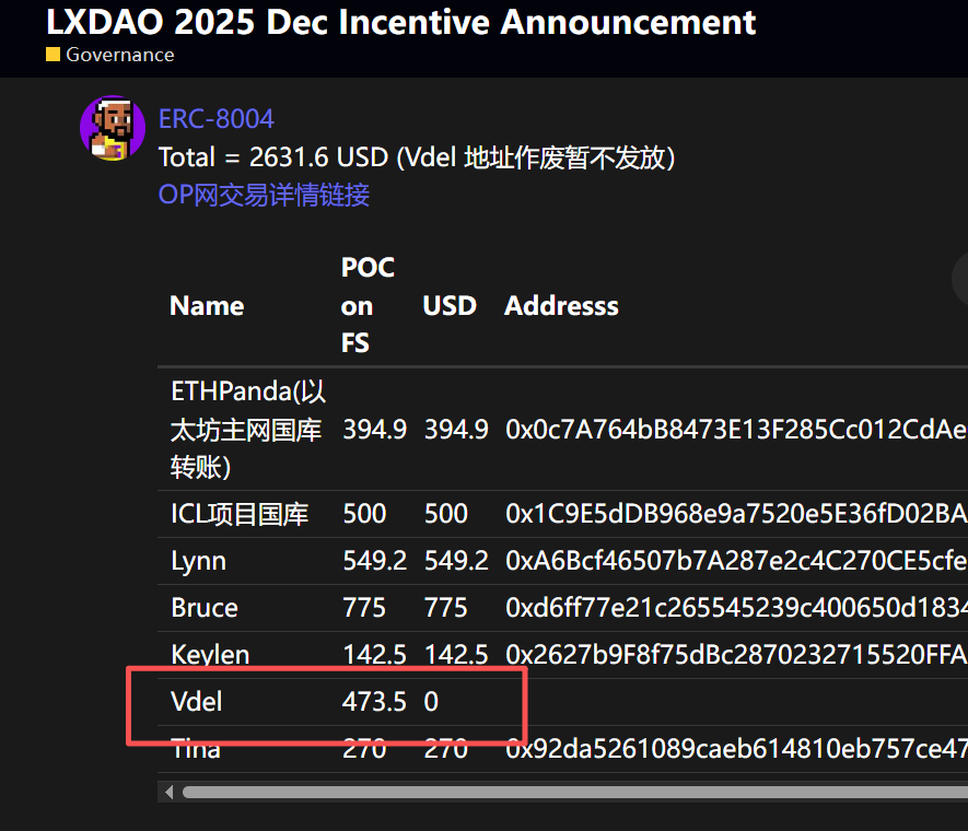 | Vdel | 1369.8 | 1369.8 | 0x3F0ea9127497Ca98115c061Fd7c03feDaCfc6E42 | 其中298.1 属于11月补登记;598.2 属于10月未发放;473.5 属于 ERC8004 项目未发放 |