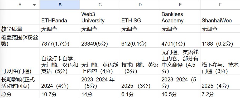 前面的回复讲得都很有道理,但我发现了一个问题。共四个人发表观点,其中三个人都把 Web3 University 排在第一位。我认为其中必有猫腻。这五个组织都是很好的组织,就算 Web3 真的比其它几个略好一些,也不至于75%的人都认准它,这已经超出了概率所能解释的范畴。所以,我建议把 Web3 University 的权重放低,至少不要把它作为 top1。